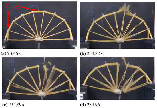 Figure 10 depicts the spaghetti bridge used in the AE test, undergoing its load test during the contest, and its corresponding collapse load is also highlighted (in red) in Figure 8. This bridge was long, wide and high, with of mass. Load was increasingly applied manually to its center line, with increments in 10 intervals until collapse occurred at , with . Two accelerometers [44] were installed on the spots that are marked as and in Figure 10a, for acquiring the AE signals. The sensors were located at the bridge arc, in the regions most expected to present AE events: near one of the bridge supports and at mid-length, where the loads were applied. The AE analysis uses the signals from , with as a secondary reference to confirm the identification of AE events. The sensors are piezoelectric accelerometers, with frequency measurement in lineal range from 5–60. Their signal was acquired through a data acquisition module Brüel & Kjær® PULSE™ 3035, at a sampling rate of . A Nyquist-type filter with a cutoff frequency of 30 was used in order to reduce noise and to avoid aliasing.