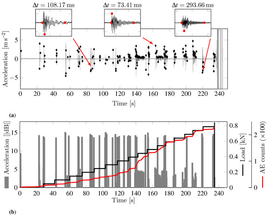 Throughout the incremental loading test, 230 signals were detected by the AE sensors. The overall result is shown in Figure 11a, which also depicts a few typical signals for individual events. These results are also summarized in Figure 10b, in terms of amplitude peak for each signal and their cumulative number in relation to the load.