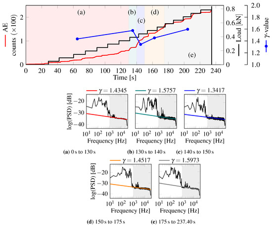 The AE data set was divided into five intervals to evaluate frequency fluctuations, as shown in Figure 13. For each interval, the results from computing the Power Spectral Density (PSD) were plotted in the logarithmic scale, with a linear fit being applied to the region where the frequency distribution approximates a straight line in the bi-log dominium, i.e., in the range from to . The angular coefficient for the resulting fitting line is the parameter that is used to evaluate frequency fluctuation. Frequencies that are below 1 cannot be reliably traced to the damage process because of interference with the structure’s natural vibration modes. The marked attenuation for frequencies that are above 30 is due to the anti-alias filtering embedded in the signals’ electronic conditioning apparatus.