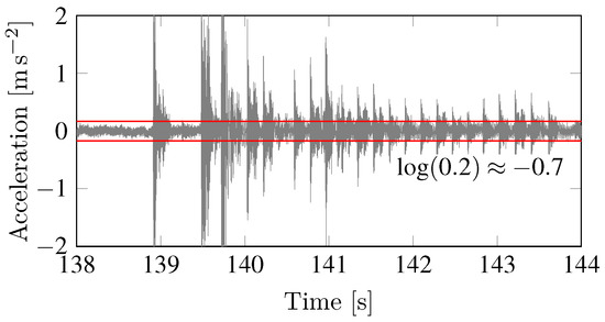 The acceleration pattern typically acquired during the tests, with the amplitude threshold that defined actual AE-signals.