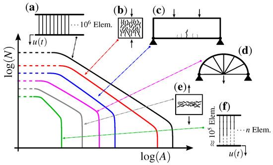 - The results that are presented here suggest that the damage process occurs according to a general pattern that is similar to the one predicted by the Bundle Model. However, this tendency suffers in varying degrees from the effects of measurement noise, the structure’s external geometry, the boundary conditions applied to it, and the internal organization of the system’s elements. The influence that is exerted by these factors is illustrated schematically in Figure 16. The two extreme cases correspond to the predictions given by the Bundle Model when all fibers are aligned in parallel (a) or almost entirely in series (f), whereas cases (b)–(e) represent several combinations of geometry and externally applied loads, which appear as intermediate arrangements within the context of the model. Thus, the spaghetti bridge configuration studied here is closer to the quasi-serial Bundle Model (case (f)), which is more prone to localization effects than the other cases. Finally, all profiles tend to a “platea” for small-amplitude events due to the need to apply a threshold value for negating measurement noise effects.
