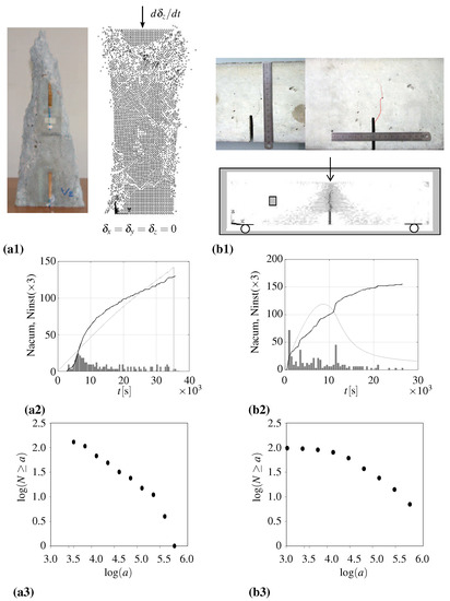 Figure 18. AE simulation results on concrete structures. (a) prism under uniaxial compression, (b) pre-fissured beam. (1) Results in terms of final configurations. (2) load vs time response (light-gray line), accumulated number of AE signals (dark line), and instantaneous distribution of events (histogram bars) (3) Accumulated number of signals vs. their magnitudes in bilogarithmic scale [46].