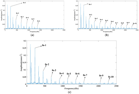 Next, PMGI values are calculated for each mode component, and mode components that exceed the average values for reconstruction and envelope spectrum conversion are selected for use in extracting fault feature frequencies and identifying frequency doubling; the result is shown in Figure 12. By adopting the CEEMDAN and ITD methods, only four harmonics of the fault feature frequency can be clearly identified. The method that is proposed in this paper yields two more peaks of the fault feature frequency compared with these two methods. Therefore, the proposed method outperforms the others in terms of practical fault feature extraction.