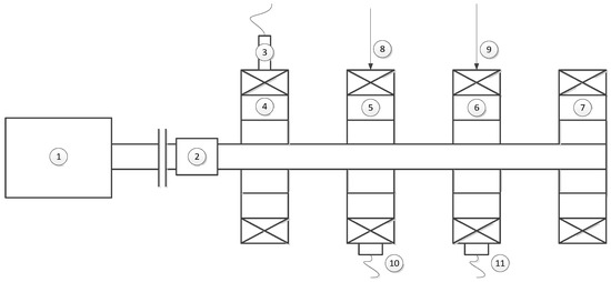 Functional schematic diagram of the test platform. 1—electric spindle; 2—coupling; 3—temperature sensor; 4—accompanying bearing; 5—subject bearing; 6—subject bearing; 7—accompanying bearing; 8 and 9—loading system; 10 and 11—accelerometer.