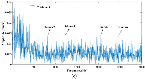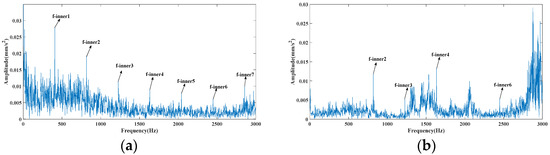 The sampling frequency was 8192 Hz, and the data length was 4096 points. The bearing rotation speed was 3000 rpm. Based on Table 4 and Table 5, the fault feature frequencies of the inner ring were calculated as 407 Hz, and in the envelope spectrum, the fault feature frequencies of the inner ring and outer ring were , , , , and .