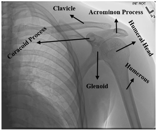 Having a wider and more varied range of movement than the other joints in the body, the shoulder has a flexible structure. The fractures in the shoulder may result from incidents such as dislocation of the shoulder and engaging in contact sports and motor vehicle accidents. The shoulder bone mainly consists of three different bones: the upper arm bone, named the ‘humerus’, the shoulder blade, named the ‘scapula’, and the collarbone, named the ‘clavicle’. Figure 1 shows the anatomic structure of the shoulder bone. The image in this figure was taken from the MURA dataset used in this study, and the markings thereon were placed by the physicians at Gazi University. As shown in Figure 1, the upper end of the humerus has a ball-like shape that connects with the scapula, called the glenoid. The types of shoulder fractures vary depending on age. While most fractures in children occur in the clavicle bone, the most common fracture in adults occur on the top part of the humerus, i.e., the proximal humerus. The types of shoulder bone fractures are divided into three categories in general: clavicle fractures, which are the most common shoulder fracture, frequently the result of a fall, scapula fractures, which rarely occur, and resulting fractures, which occur as cracks in the upper part of the arm in individuals over 65 years of age. The images from X-ray devices are primarily used for imaging of the shoulder bone for diagnosis and treatment of such fractures, while MRI or CT devices may also be used when required [1].