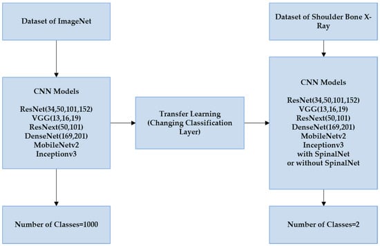 In this transfer learning method, two versions of each available deep learning model pre-trained with ImageNet data, i.e., the existing weights in the pre-trained models, were used. ImageNet is a dataset and benchmark that contains millions of images and hundreds of object categories, on which the procedures of image classification, single-object localization, and object detection are mainly performed [27]. The shoulder bone X-ray images dataset used in this study was used for input of the deep learning models, which are specified in Figure 2 and were trained with ImageNet data. The structure comprised of 1000 classes in the last layer of these models was made to have two classes in order to classify bone images specific to our study as normal and abnormal. Following the abovementioned procedures, classification was carried out by training the network with the shoulder dataset. Moreover, the last layer of 13 built deep learning models were fine-tuned with SpinalNet/Spinal FC; with the newly acquired models, shoulder bone X-ray images were trained and classified.