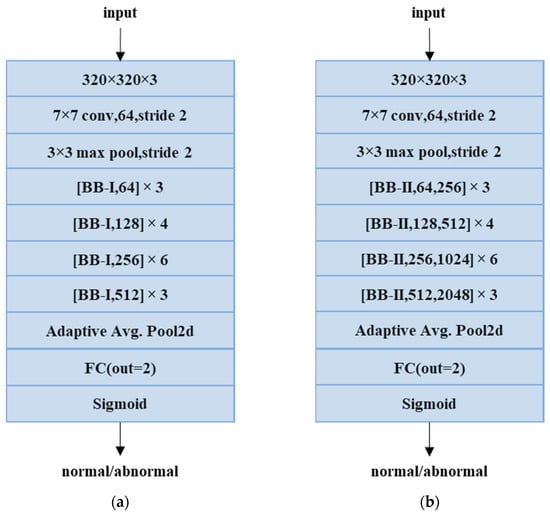 In this study, four ResNet models with 34, 50, 101, and 152 layers, respectively, were used in classification. The models were adapted, and the structure is shown in Figure 4.