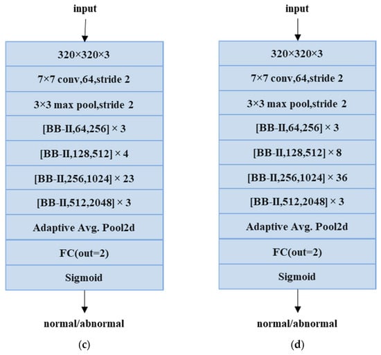 The structure of the adapted ResNet-based models. (a) ResNet34; (b) ResNet50; (c) ResNet101; (d) ResNet152.3.1.2. ResNeXt [28].