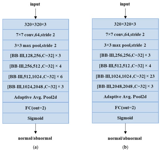 The structure of the adapted ResNeXt-based models. (a) ResNeXt50 (32 × 4d); (b) ResNeXt101 (32 × 8d) [29].