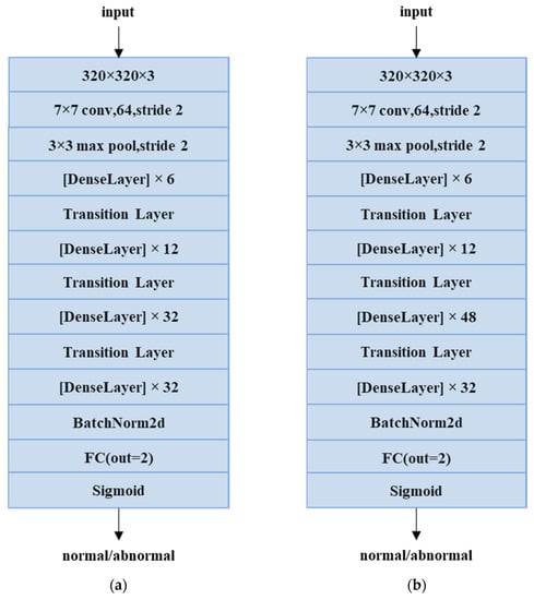 The structure of the adapted DenseNet-based models. (a) DenseNet169; (b) DenseNet201 [30].