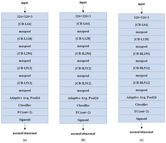 The structure of the adapted VGG-based models. (a) VGG13; (b) VGG16; (c) VGG19 [31].