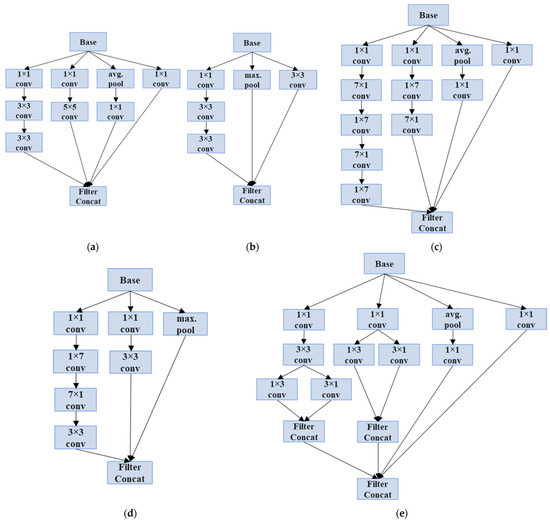 The inception blocks containing convolution factorization (IB-A, B, C, D, and E). (a) IB-A; (b) IB-B; (c) IB-C; (d) IB-D; (e) IB-E [32].