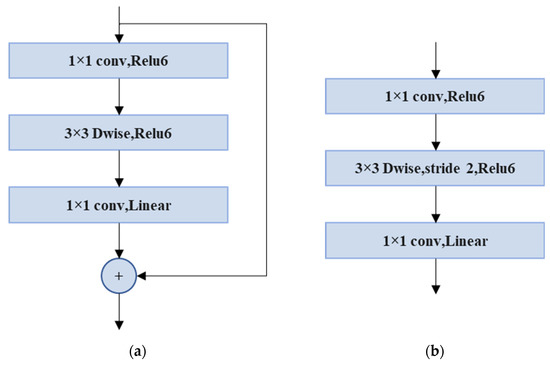 MobileNet bottleneck blocks where stride = 1 and stride = 2, respectively (MB-I and -II). (a) MB-I; (b) MB-II [33].