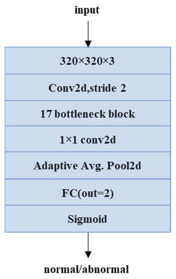 The MobileNetV2 model was used in classification in this study. The structure of this MobileNetV2-based model, which contains a total of 17 MobileNet bottleneck blocks, comprised of 13 bottlenecks with a stride value of 1, and 4 bottlenecks with a stride value of 2, is shown in Figure 13.