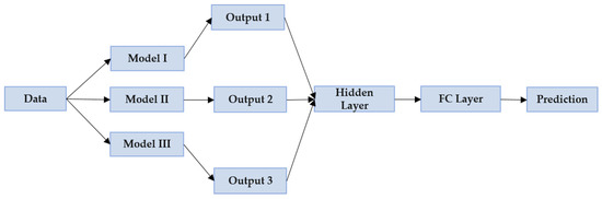 The EL2 (Ensemble learning-2) model was developed using a combination of ResNet34 with Spinal FC, DenseNet169 with Standard FC, DenseNet201 with Spinal FC, and a sub-ensemble model. A schematic diagram of the developed model is provided in Figure 16. It is observed upon examination of the figure that the EL2 model, differently from the EL1 model, consists of three single models and one sub-ensemble model and has a different structure. The “X-ray Images” specified in the figure refers to the dataset containing shoulder bone images, “Model I” to the ResNet34 model with Spinal FC, “Model II” to the DenseNet201 model with Spinal FC, “Model III” to the sub-ensemble model, “Model IV” to the DenseNet169 model with Standard FC, and “Predictions I–IV” refer to the outputs of the classification performed with these four models. The parts of the procedure for the proposed EL2 ensemble model are as follows: