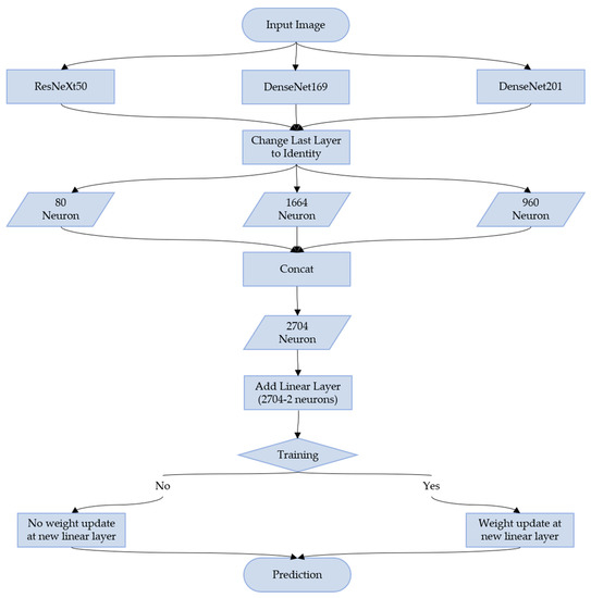 The EL1 (Ensemble learning-1) model was developed using a combination of ResNext50 with Spinal FC, DenseNet169 with Standard FC, and DenseNet201 with Spinal FC. A schematic diagram of the developed model is shown in Figure 14.