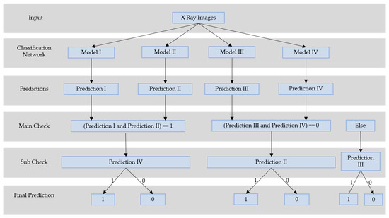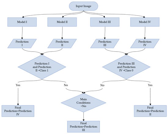 - Part 4: In the “Main Check” section, there is a main check mechanism that plays a role in determining the class of the input image. Therein, Models I and II suggest classifying the input image as abnormal in the final classification, while Models III and IV suggest classifying the input image as normal in the final classification. In cases where suggestions are not available, the classification is carried out with the sub-ensemble model. In the selection of the referred models for each class, Confusion Matrix and Recall parameters previously obtained for the 26 CNN models were taken into consideration.