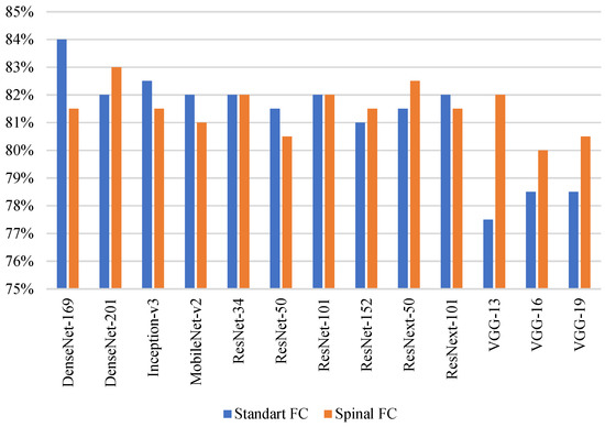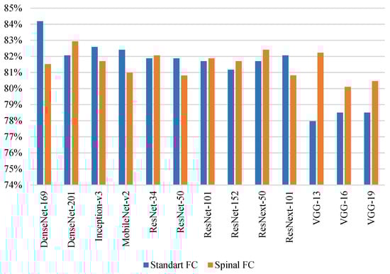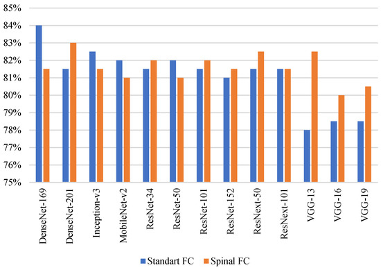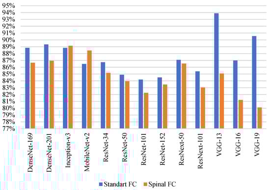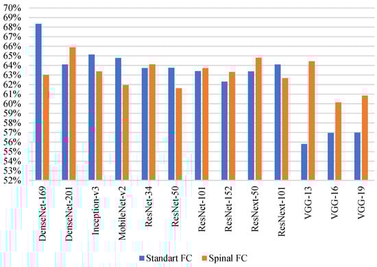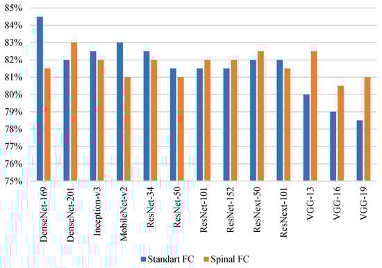 Figure 21 shows that the highest training accuracy in classification is achieved by VGG13 among models with Standard FC and by InceptionV3 among models with Spinal FC. The test accuracy in Figure 22, the precision in Figure 23, the recall in Figure 24, the F1-score in Figure 25, and Cohen’s kappa score in Figure 26 show that the highest scores are achieved by DenseNet169 among models with Standard FC and by DenseNet201 among models with Spinal FC.