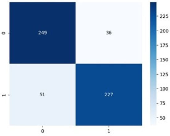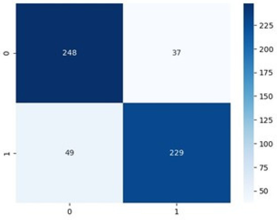The confusion matrix specified in Figure 27 was a result of the classification performed using the EL1 model. The following results are concluded as per the figure: TN: 249, FP: 36, FN: 51, and TP: 227.