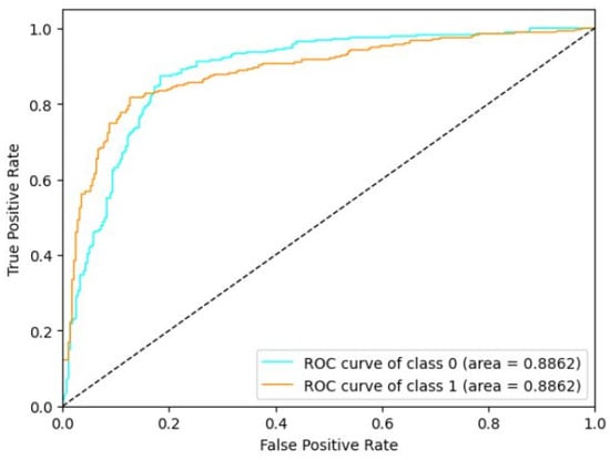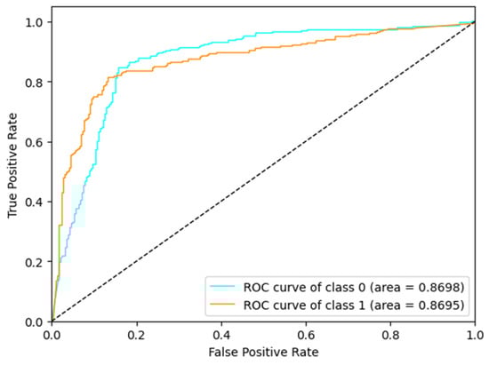 The ROC curves and AUC scores achieved as a result of the classification performed with the EL2 model are provided in Figure 30. The AUC scores are 0.8698 for Class 0 (normal, negative) and 0.8695 for Class 1 (abnormal, positive, fracture). Although these AUC scores appear to be slightly decreased compared to the EL1 model, since the test accuracy, Cohen’s kappa scores, and the number of detected shoulder bone fracture images (TP) in the EL2 model are higher than the EL1 model, the EL2 model overall provides better results.