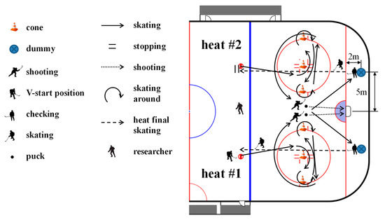 Testing on-ice skating performance is fundamental to determine the specific performance of ice hockey players. In previous studies off-ice performance (countermovement, squat, drop, hop, broad and standing long jump tests, grip strength, push-ups, sit-ups, upper body push and pull, leg press and bench press tests, different sprinting and agility tests, as well as the Wingate test, YoYo intermittent recovery, or other aerobic power tests) were analyzed to determine the relationship to hockey playing potential [6,7], draft status [8] or on-ice skating performance [9,10,11,12,13,14]. Players of higher performance levels performed better in off-ice and on-ice-tests, and there is a strong relationship between on-ice performance and several off-ice performance parameters [6,7,8,9,10,11,12,13,14,15,16]. However, most of these studies use forward sprint skating tests (distances ranging from 6 to 55 m and repeated sprint tests) to determine the on-ice skating performance in ice hockey, although forward sprinting occurs only 5% of the total time during an international game [4], and ankle motion and force production are different between forward skating and other specific skills like crossovers [17,18]. Only a few studies in ice hockey using tests (cornering S, repeated skate sprint, modified Reed repeat sprint skate test, cone agility, 5-10-5 pro agility and short radius turns test) including starts, stops, crossovers, and turns [9,10,11,12]. However to measure the sport specific performance, it is essential to use an on-ice test including specific movements (starting, stopping, turning, hitting, and shooting) and intensities (high, moderate, and low) that closely mimic competition to determine specific on-ice performance.