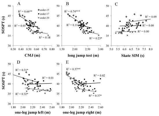 Linear regression analysis scatter-plot of the specific overall skating performance test (SOSPT) and (A) countermovement jump height (CMJ), (B) standing long jump distance (long jump test), (C) total time on the lateral skate simulation test (Skate SIM), (D) lateral single-leg jump left leg, and (E) lateral single-leg jump right leg separated by age groups into under-20, under-17, and under-15 players. (p < 0.001 ***; p < 0.01 **; p < 0.05 *).