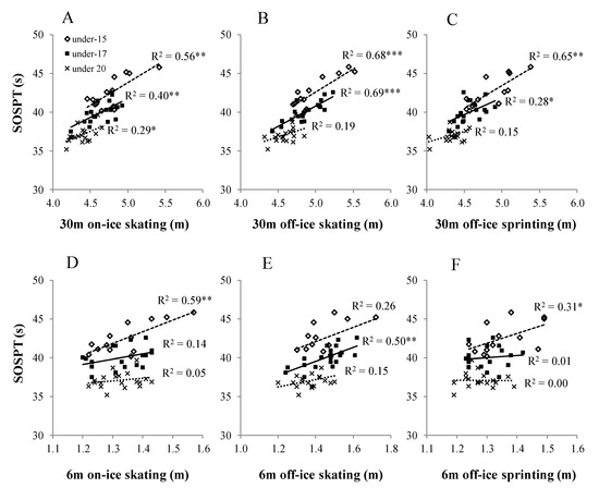 Linear regression analysis scatter-plot of the specific overall skating performance test (SOSPT) and (A) 30 m on-ice skating, (B) 30 m off-ice skating, (C) 30 m off-ice sprinting, (D) 6 m on-ice skating, (E) 6 m off-ice skating, and (F) 6 m off-ice sprinting time separated by age groups into under-20, under-17, and under-15 players. (p < 0.001 ***; p < 0.01 **; p < 0.05 *).