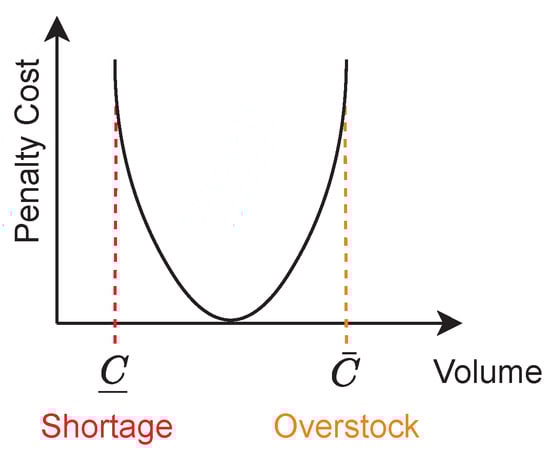 - Penalty cost: A penalty cost is assigned to prevent a shortage situation in the system. This cost depends on the volume and the minimum requirement for the drugs at time t. Without loss of generality, we refer this cost to a quadratic function to formulate our model. As shown in Figure 1, the quadratic penalty cost increases when the volume of drug i reaches the bounded values and . In other words, the penalty cost function aims to prevent both the shortage and overstock problems.