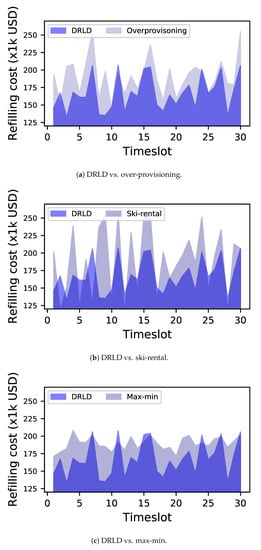 - Max-min [12]: This refilling strategy is one of the most useful mechanisms for inventory management. By using the min level, a trigger will be active to make a refilling decision to obtain the maximum target quantity. To prevent the shortage problem, the min value is often set with a high volume (we use 45% in our work); therefore, the max-min baseline also results in a high total cost.
