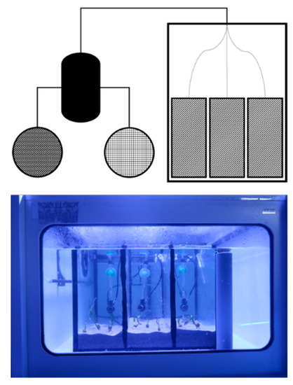 Water parameters, including pH, dissolved oxygen, temperature, conductivity, and salinity, were measured in each aquarium every three days using a multi-parameter probe (WTW Multiprobe). Water samples for silicate and phosphate were taken every week from random aquaria of each treatment (n = 2) and from both water reservoirs with a syringe, immediately filtered (0.45 µm pore size) in pre-rinsed polyethylene bottles, and frozen (−20 °C). Analysis was performed using a continuous flow injection analyzing system (Skalar SAN++-System) following standard methods for nutrient analysis [42].