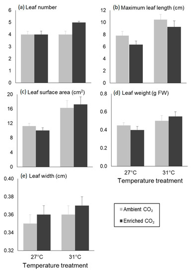The responses of leaves to the temperature and CO2 treatments differed across morphological traits (Figure 2 and Table 2). The highest leaf number was found in the 31 °C-enriched CO2 treatment with a mean of five leaves per seedling, showing a significant interaction effect (Figure 2a and Table 2).