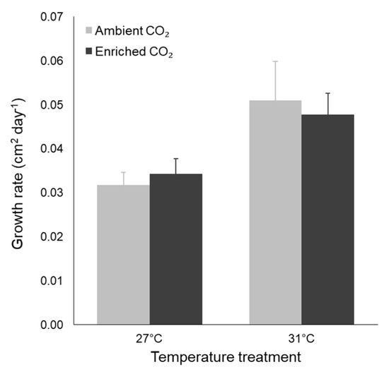 The effect of increasing temperature and CO2 enrichment on the leaf surface area’s growth rate of Enhalus acoroides seedlings at the end of the experimental period. Values are mean ± SE (n = 6).