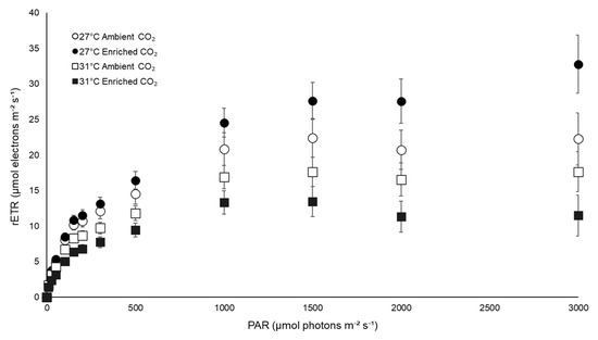 The photosynthetic performance of the leaves was significantly higher under regimes of 27 °C (Figure 4), as indicated by higher rETRmax values calculated from the rapid light curves (Table 3 and Table 4).