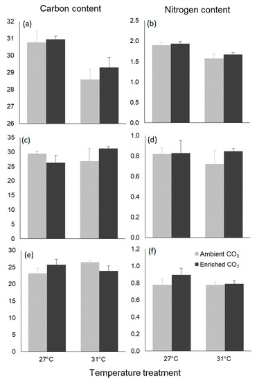 In contrast, there were no significant differences in single factor effects of temperature or CO2 in the carbon and nitrogen content within the seeds (Figure 5c,d and Table 5) or in the roots (Figure 5e,f and Table 5). However, there was an interactive effect between temperature regimes and CO2 concentration in the carbon content in the root tissue, which showed the highest concentrations in the 31 °C-ambient CO2 and 27 °C-enriched CO2 treatments (Figure 5e and Table 5).