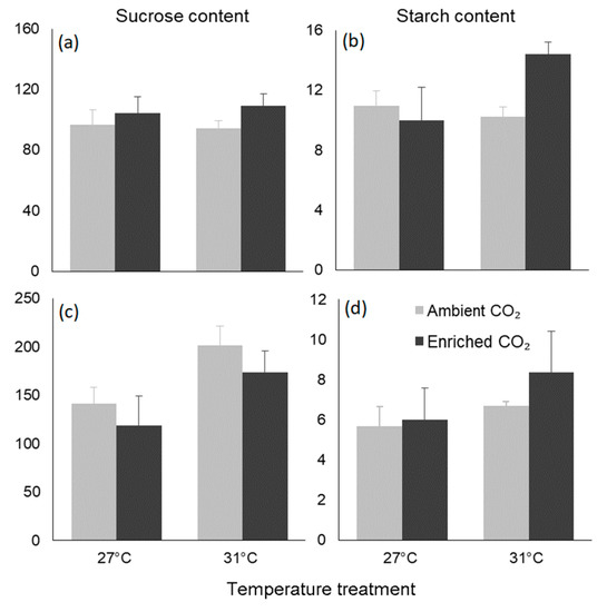 Leaf sucrose and starch concentrations were generally higher in enriched CO2 treatments (Figure 6a,b and Table 6). However, these differences were not statistically significant. There was an interaction effect on starch concentrations in the leaves (p-value = 0.07), which was especially high in the 31 °C-enriched CO2 treatment. In contrast to carbon or nitrogen content, sucrose concentrations significantly responded to an increasing temperature on seed tissues, which are less used in regimes of 31 °C (Figure 6c and Table 6). The highest concentrations of sucrose in the seeds were found in the 31 °C-ambient CO2 treatment, whereas the highest starch concentration in the seeds was found in the 31 °C-enriched CO2 treatment, even though differences were not significant (Figure 6c,d and Table 6).