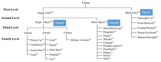 All the evaluation data sets come from ImageNet [43]. The constructed dataset can be divided into three branches according to the category and the number of objects contained in the image. As shown in Figure 3, the three branches are images containing only a single object (DataS), images containing multiple objects of the same category (DataM), and images containing two objects of different categories (DataT).