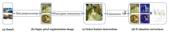 The purpose of Accuracy Evaluation (AE) is to quantitatively evaluate different interpretation methods through the ground truth of features labeled by users. In order to realize this idea, we designed a web-based feature annotation tool to interactively acquire key features of different categories of images. Figure 4 shows the whole process of AE, which consists of four parts: evaluation data, feature segmentation, interactive annotation tool design and quantitative evaluation. The following details our interactive feature annotation core module(Figure 4c).