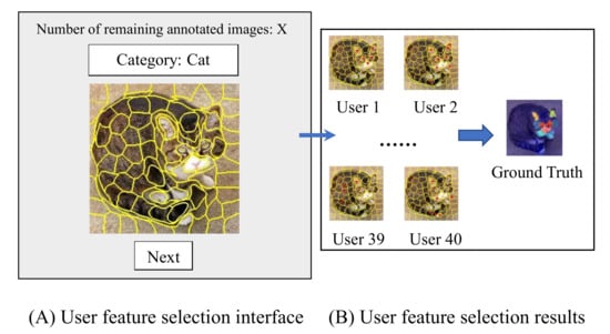 Figure 5 shows our annotation interface and the process of generating ground truth maps. We created ground truth map through a two-step procedure. First, the feature block for every image selected by each participant is recorded (Figure 5A). In order to facilitate the user to select features, inspired by [44], we used the SLIC algorithm [45] to perform superpixel segmentation preprocessing operations on the evaluation dataset. Second, ground truth map is generated by integrating the feature blocks selected by the participants (Figure 5B). (Note that in order to make the ground truth map more accurate while taking into account operability, we recruited a total of 40 high-quality participants).