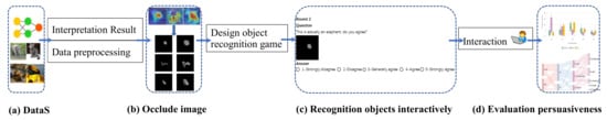 The primary goal of persuasibility evaluation (PE) is to quantitatively measure the degree of user satisfaction with different interpretation methods. We designed a game that occludes partial explanations and allowed users to interactively answer object name to achieve this goal. The main components are shown in Figure 6. PE takes a trained VGG-16 CNN model and the corresponding evaluation dataset (DataS) as the input (Figure 6a). In the data processing stage, FSM about the prediction results are generated and feature occlusion operations on these interpretation images are performed (Figure 6b). The occlude images is then passed to the recognition object module. This module is developed in the form of questionnaires, including three rounds to collect user results interactively (Figure 6c). Finally, we evaluate different interpretation methods by analyzing user feedback data. Specifically, we use box plots [46] to analyze user satisfaction ratings, and use Sankey Diagram [47] to demonstrate user selection changes (Figure 6d).