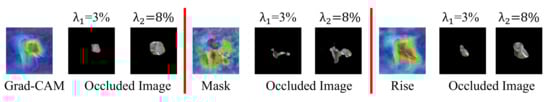 Three visual interpretation algorithms retain 3 % and 8% feature occlusion maps.