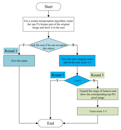 Once the recognition game starts, the user will progressively go through three rounds to name the category and score the category satisfaction of occluded image (Figure 8). In round 1, the top-3 occlusion image is first shown to the user, and the participants are asked whether they can recognize the object. If the user answers yes, the specific name of the object needs to be given. Otherwise it will go to round 2. In round 2, we further provided the category information of the corresponding occluded image, and at the same time asked the user whether he agreed with the given category, and scored 1–5. In round 2, users score 1–5 for category satisfaction. If the user scores 1 or 5 points, the entire process ends. If the user chooses 2, 3, 4 points, the round 3 is entered. In round 3, the feature range of the occluded image will be expanded from 3% to 8%, and the user scores 1–5 for the 8% occluded image. To sum up, the PE included an object name recognition question in round 1 and a 5-point Likert-scale [48] question in round 2 and round 3 (See Appendix A for the detailed recognition interface).