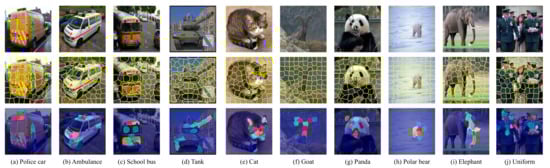 Examples of ground truth result of the relevant feature block marked by the user of each category. (TOP) The 10 input image samples in 10 categories from the evaluation data set DataS. (Middle) Segmented image with 100 feature blocks obtained according to the SLIC segmentation algorithm. (Bottom) Resulting multi-participants human attention mask. Each image is annotated by 40 unique participants.