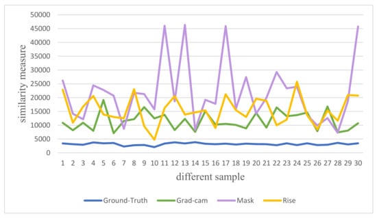 Figure 10 shows the similarity result of 30 different samples with three different interpretation methods relative to the human attention (ground truth) mask. The similarity measurement result indicated the similarity between the FSM obtained by the interpretation method and the human-attention mask. The smaller the value, the more similar. At the same time, we calculated the average value of each interpretation algorithm relative to ground-truth. As shown in the Table 1, Grad-cam interpretation algorithm had the lowest MAE value, which is the best correctness. The correctness of rise interpretation method was ranked second.