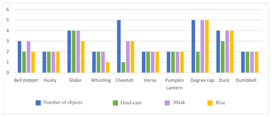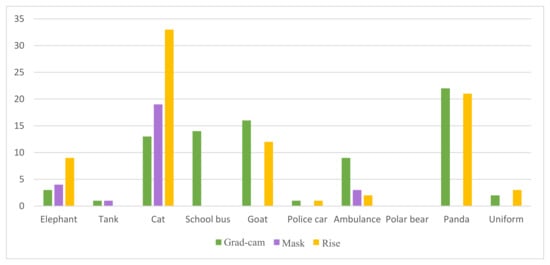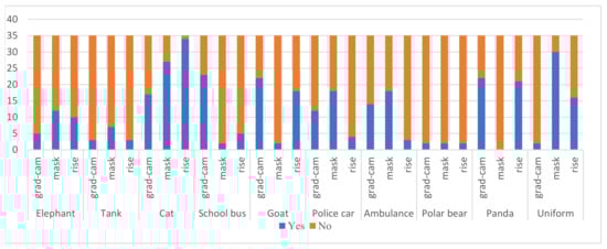 Figure 11 shows the statistical results of the number of users who could answer the object name based on the top 3% feature occlusion map based on different interpretation methods in Round 1. Figure 12 shows the correct number of users who gave the object name in all the different interpretation methods. We can see that the explanation given by the mask algorithm had many users who choose to answer the name of the object, but the correct rate of the answer was very low. For the interpretation result given by the Grad-cam algorithm, the correct rate of the user’s answer was the highest.