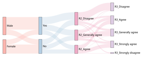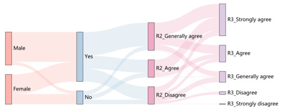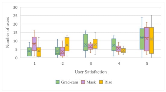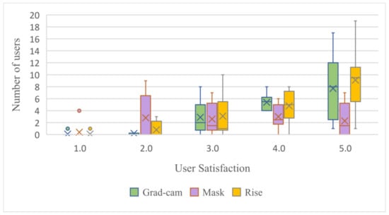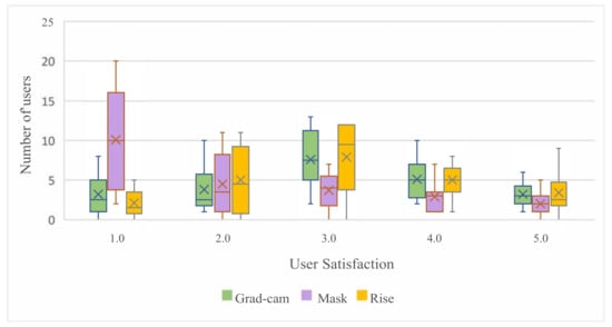 We further analyzed the user’s satisfaction with the interpretation given by different interpretation algorithms in Round 2 and Round 3. Figure 13 shows the distribution of user satisfaction with different explanation methods after informing users of category information. Figure 14 shows the distribution of user satisfaction regarding whether to agree with category information after the feature interpretation areas was expanded from 3% to 8%. We can see that when the user satisfaction was 1, for the Mask algorithm, the number of users was the largest. However, when the user satisfaction is 3, 4, or 5, the Grad-cam algorithm has a larger number of users compared to the Mask and Rise algorithms.