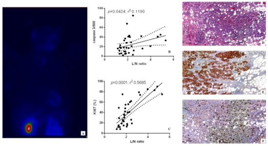 The percentages of Ki67-positive breast cancer cells, evaluated by immunohistochemistry, have been used as proliferation index values. According to our previous investigation, a positive and significant correlation between sestamibi uptake and the proliferation index was observed (p < 0.0001; r2 0.5685) (Figure 1C,F).