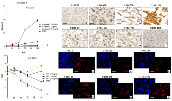 In detail, cells from the first or second passage were seeded into a 24-well plate at a density of 30 × 103 cells/well. Successively, BT-474 cells were incubated with: (a) [99mTc]Tc-Sestamibi 10 µg/mL, (b) [99mTc]Tc-Sestamibi 1 µg/mL, and (c) [99mTc]Tc-Sestamibi 0.1 µg/mL. The expression of both Ki67 and caspase-3 were evaluated at T0 and after 24, 48, 72, and 120 h after sestamibi incubation. Cells treated with the vehicle (lyophilisate resuspended) were used as a control (CTRL).