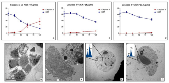 Comparison between apoptosis and proliferation of BT474 breast cancer cells treated with [99mTc]Tc-Sestamibi and ultrastructural analysis. (A) Graph shows the number of both caspase-3- and Ki67-positive BT474 breast cancer cells after 24, 48, 72, 96, and 120 h of [99mTc]Tc-Sestamibi incubation (10 µg/mL). (B) Graph displays the number of both caspase-3- and Ki67-positive BT474 breast cancer cells after 24, 48, 72, 96, and 120 h of [99mTc]Tc-Sestamibi incubation (10 µg/mL). (C) Graph shows the number of both caspase-3- and Ki67-positive BT474 breast cancer cells after 24, 48, 72, 96, and 120 h of [99mTc]Tc-Sestamibi incubation (10 µg/mL). (D) Electron micrograph displays ultrastructure of BT474 breast cancer cells (CTRL T0). (E) Image shows an apoptotic breast cancer cell (asterisk) close to a non-apoptotic cell (10 µg/mL at 48 h). (F,G) EDX spectrum revealed the presence of [99mTc]Technetium into the cytoplasm of apoptotic cells (10 µg/mL at 120 h).