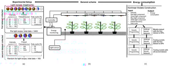 In the literature, the relationship between the spectral quality of radiation and the development and growth of crops is widely addressed. Research shows that the combination of different wavelengths can enhance the antioxidant capacity, calcium, potassium, magnesium, and phosphorus levels, number of fruits, and dry and fresh weight of vegetable crops including lettuce, spinach, kale, basil, and sweet pepper crops, among others [15,16,17]. Ten light recipes (as shown by the circles at the top of Figure 1a) in continuous and pulsed mode were used in this research to produce the first dataset (Table 1). These light recipes were selected based upon information provided in the literature. The letters in the treatments (Table 1 and Table 2) indicate the first letter of the color used (R = red, B = blue, G = green, and W = white). The intensities applied were 50, 65, 80, 95, 110, 125, 140, 155, 170, 185 µmol m−2 s−1 and the frequency was set at 100, 500, and 1000 Hz with duty cycles of 40%, 50%, 60%, 70%, 80%, 90% for each treatment (see Figure 1a). The second dataset was constructed with the design of four different light recipes (circles at the bottom of Figure 1a) at intensities of 60, 70, 85, 90, 100, 120, 130, 150, 160, 180 µmol m−2 s−1, frequencies of 100, 500, and 1000 Hz, and with randomly selected duty cycles of 60%, 70%, and 80%, as shown in Table 2. The general configuration and control of the illumination system are shown in Figure 1b. We selected the inputs and output, splitting the dataset in 80% for training and 20% for testing. The training stage fixes the algorithm’s parameters with ten-folds cross-validation to obtain the best predictions of energy consumption through the light recipes shown in Figure 1c. Triplicate experiments for all conditions were carried out with both continuous and pulsed LED light modes.